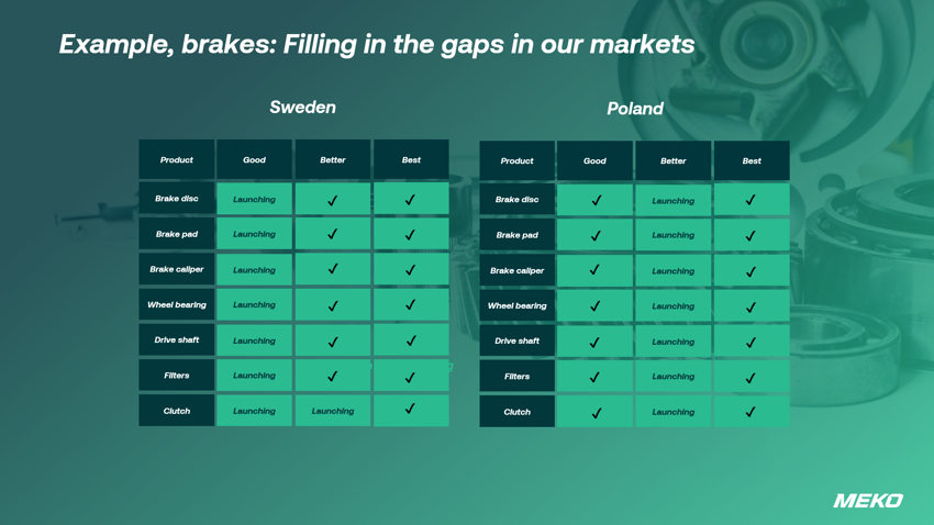 The portfolio follows the Good–Better–Best model, enabling MEKO to meet diverse customer needs in each market. For example, in brakes, Sweden lacks the entry-level “Good” segment, while Poland has yet to introduce “Better.” The strategy is to fill these gaps so that every market benefits from a complete Good–Better–Best structure.
